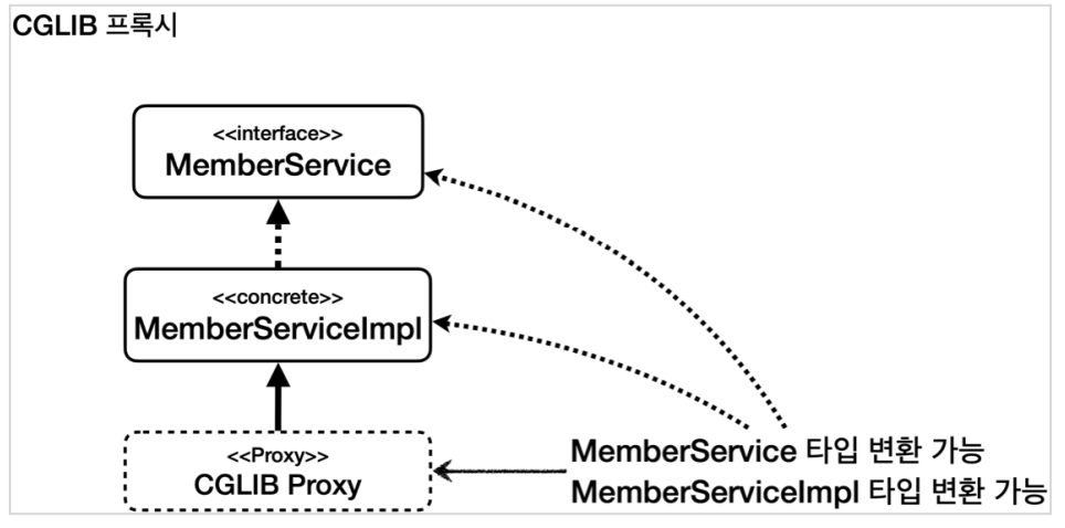 CGLIB 프록시는 구체인 MemberServiceImpl을 상속받아 프록시 객체를 만들었다. 그리고 그 슈퍼 클래스는 MemberService를 구현하고 있다. 따라서 CGLIB 프록시는 모두 타입 캐스팅이 가능하다.