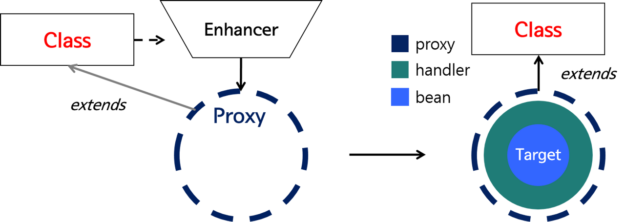 - 인터페이스 없이 단순 클래스만으로 프록시 객체를 동적으로 생성이 가능하다.