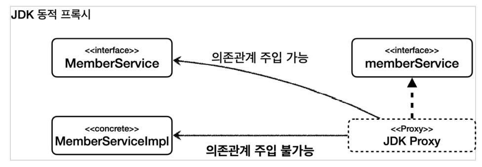 종합해보자면, JDK 동적 프록시는 구체 클래스로 타입 캐스팅이 불가능하며 이런 이유 때문에 구체 클래스 타입으로 의존관계 주입이 불가능하다. DI는 주로 인터페이스 기반으로 주입을 받기 때문에 실제 구체 클래스를 선언하는 경우가 없어 큰 문제가 없을 가능성도 있다. 하지만, 테스트 또는 여러 이류로 AOP가 적용된 프록시가 구체 클래스를 직접 의존관계를 받아야 하는 경우도 있다.